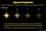 | apparent magnitude | a scale for measuring the brightness of a celestial object as it appears to an observer on Earth; bright objects have a low number while dim objects will have a higher number |